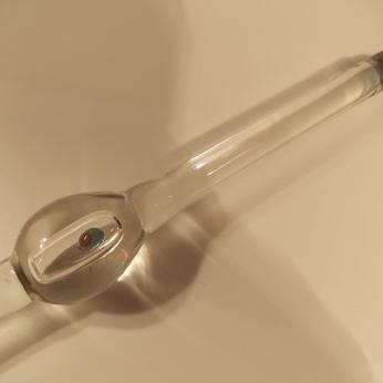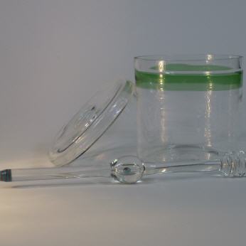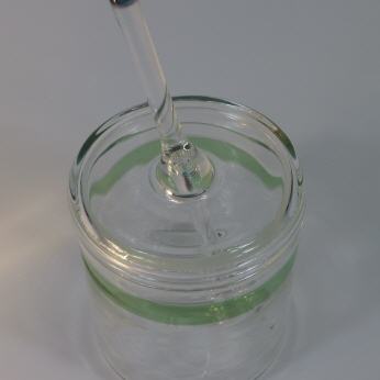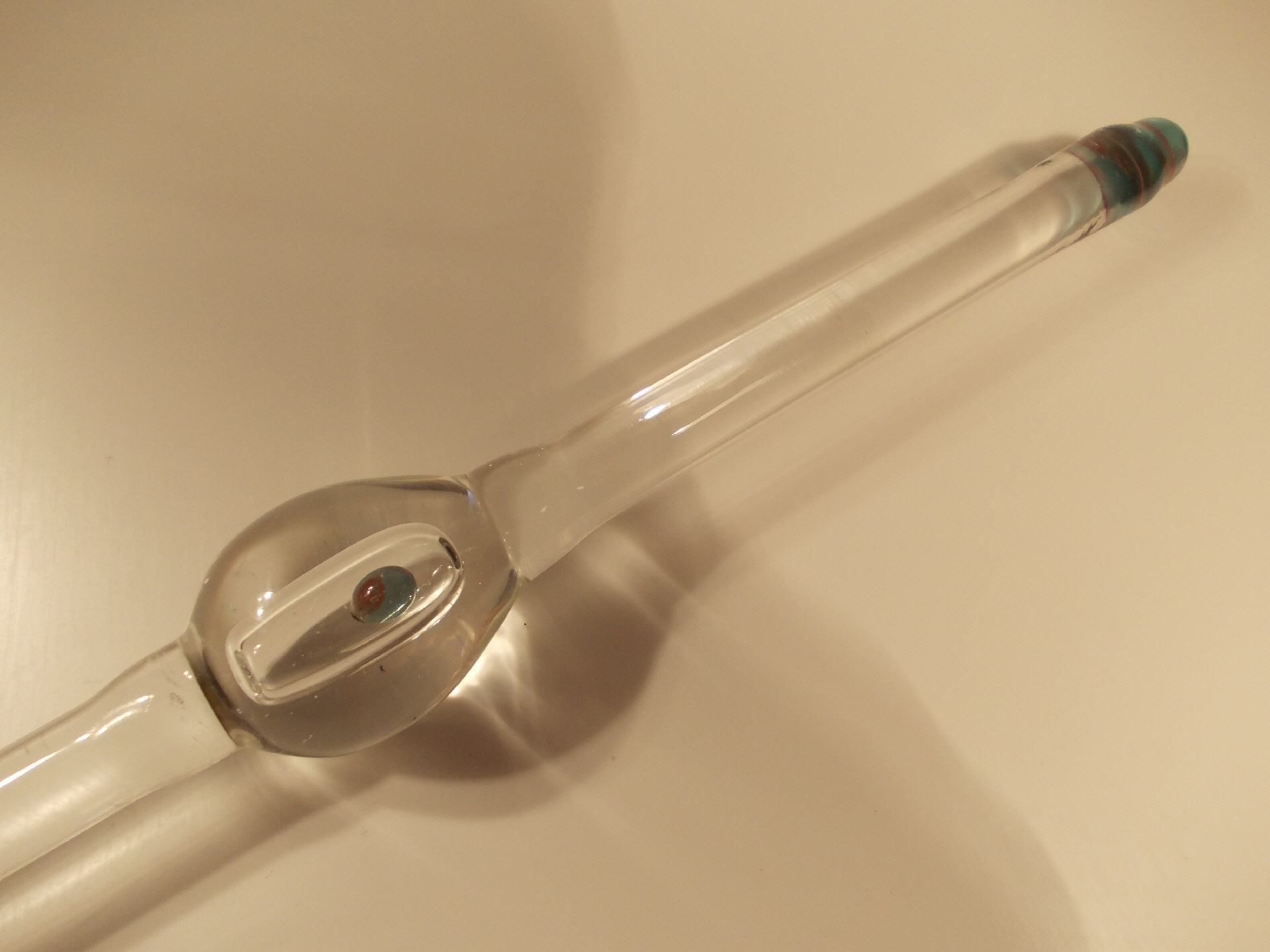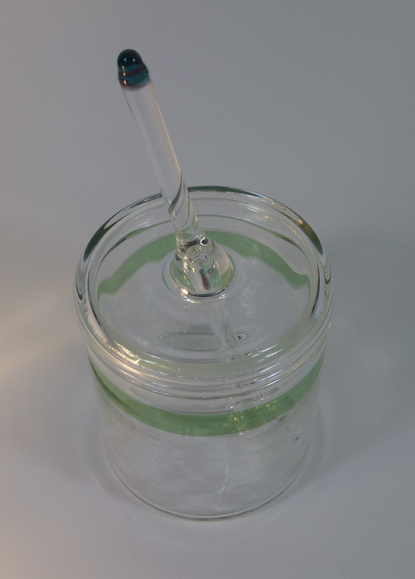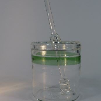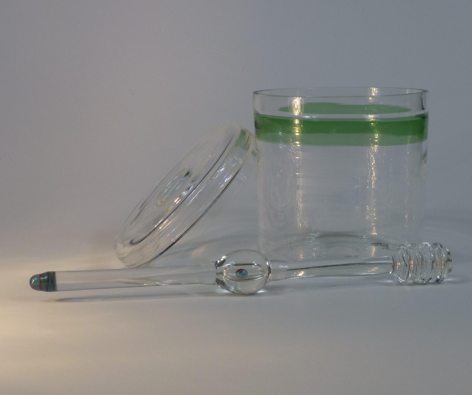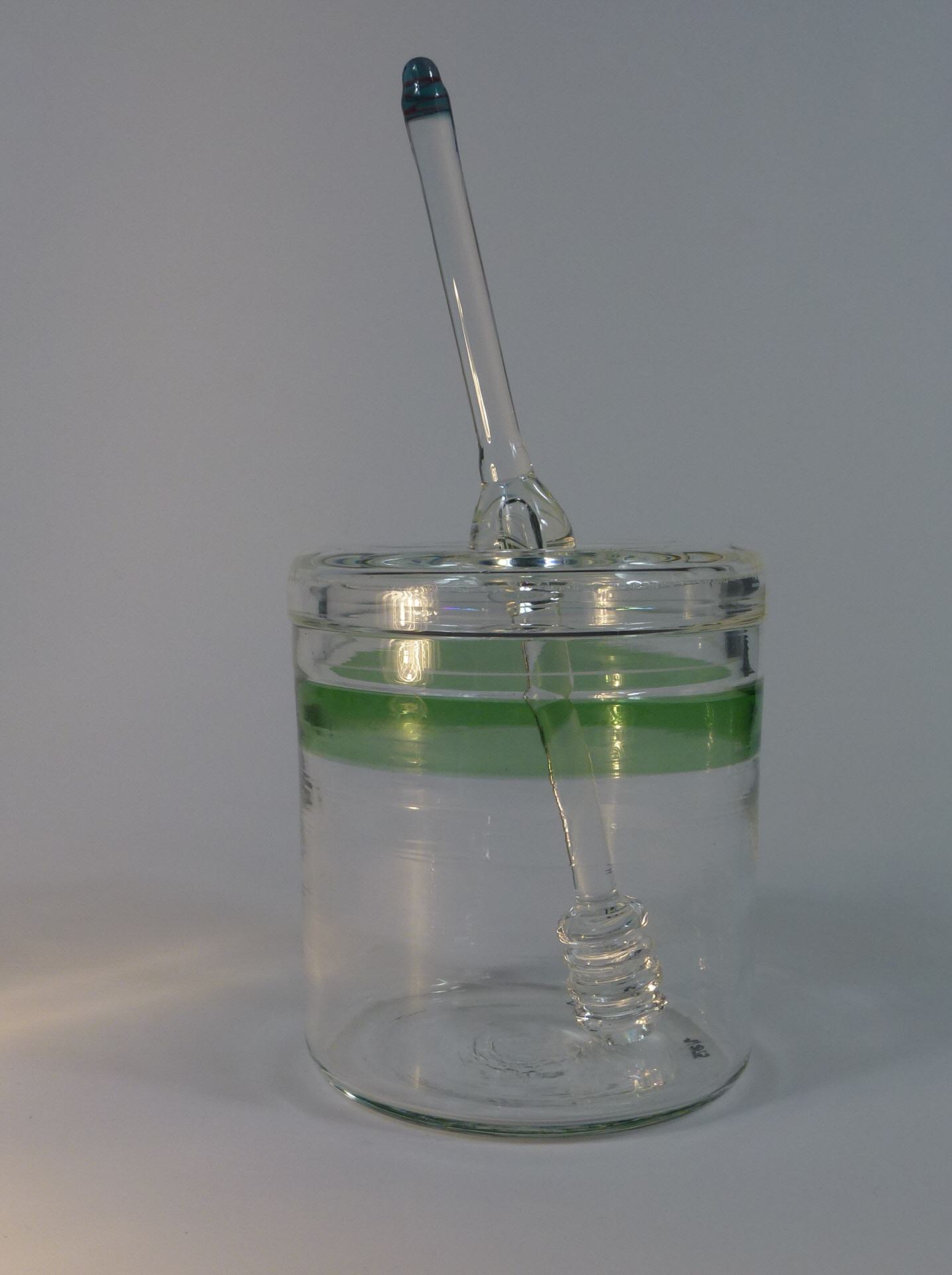 aus dem Honiglöffel, der etwa mittig verstärkt ist. Diese kugelartige Verstärkung passt exakt in das Loch des Deckel um ihn zu verschließen. Die kugelartige Verstärkung ist im Inneren hohl. Dieser Hohlraum birgt wiederum eine kleine, bewegliche, hellblaue Kugel. Das gleiche hellblaue Glas wird am Ende des Honiglöffel wieder aufgegriffen. Durch thermische Bearbeitung kann sich diese Farbe ins Rötliche ändern, was hier in feinen Äderchen zu sehen ist. Den "Fuß" des Löffel bilden vier aneinandergereihte, ringförmige Aufnahmen. Die klassische Form des Honiglöffel, welcher früher häufig gedrechselt wurde, findet sich hier wieder.
